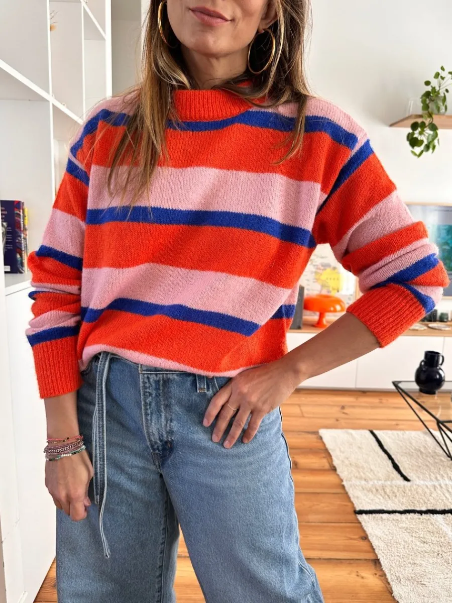 - Pull oversize à rayures horizontales bleu orange et rose pâle