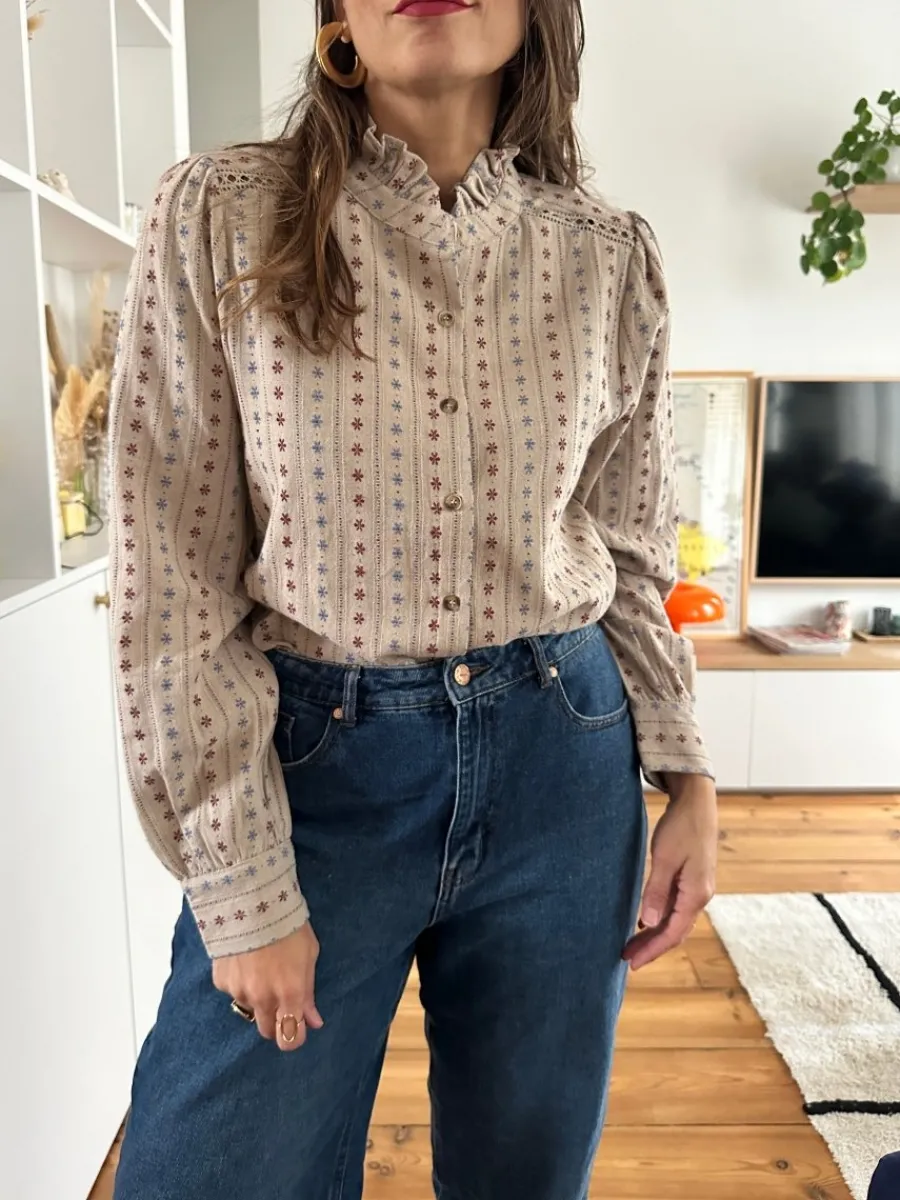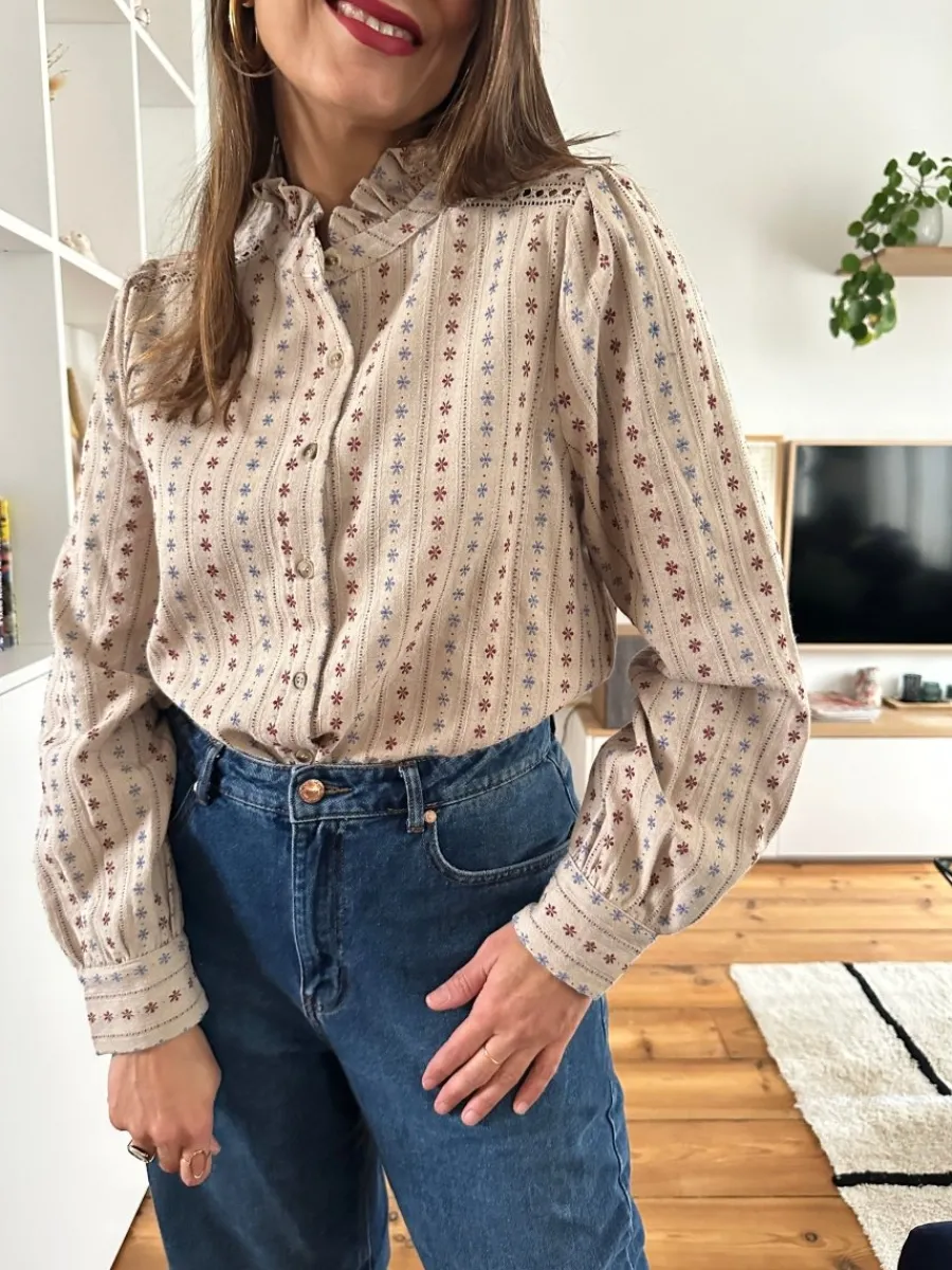 - Petites fleurs bleues et bordeaux brodées sur tout le chemisier