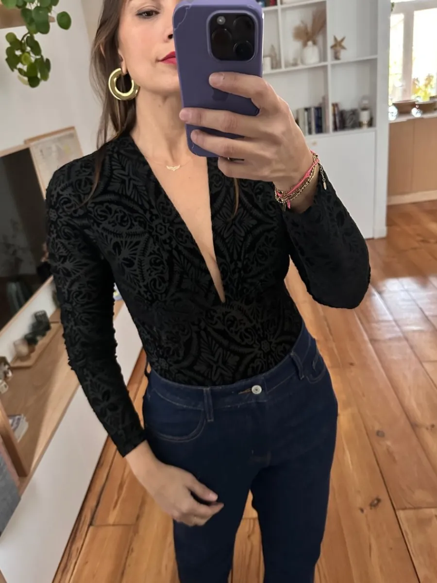 - Body noir velours jacquard à manches longues