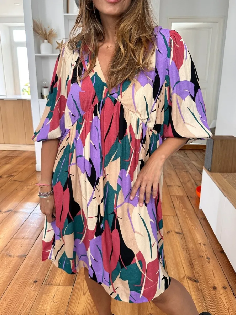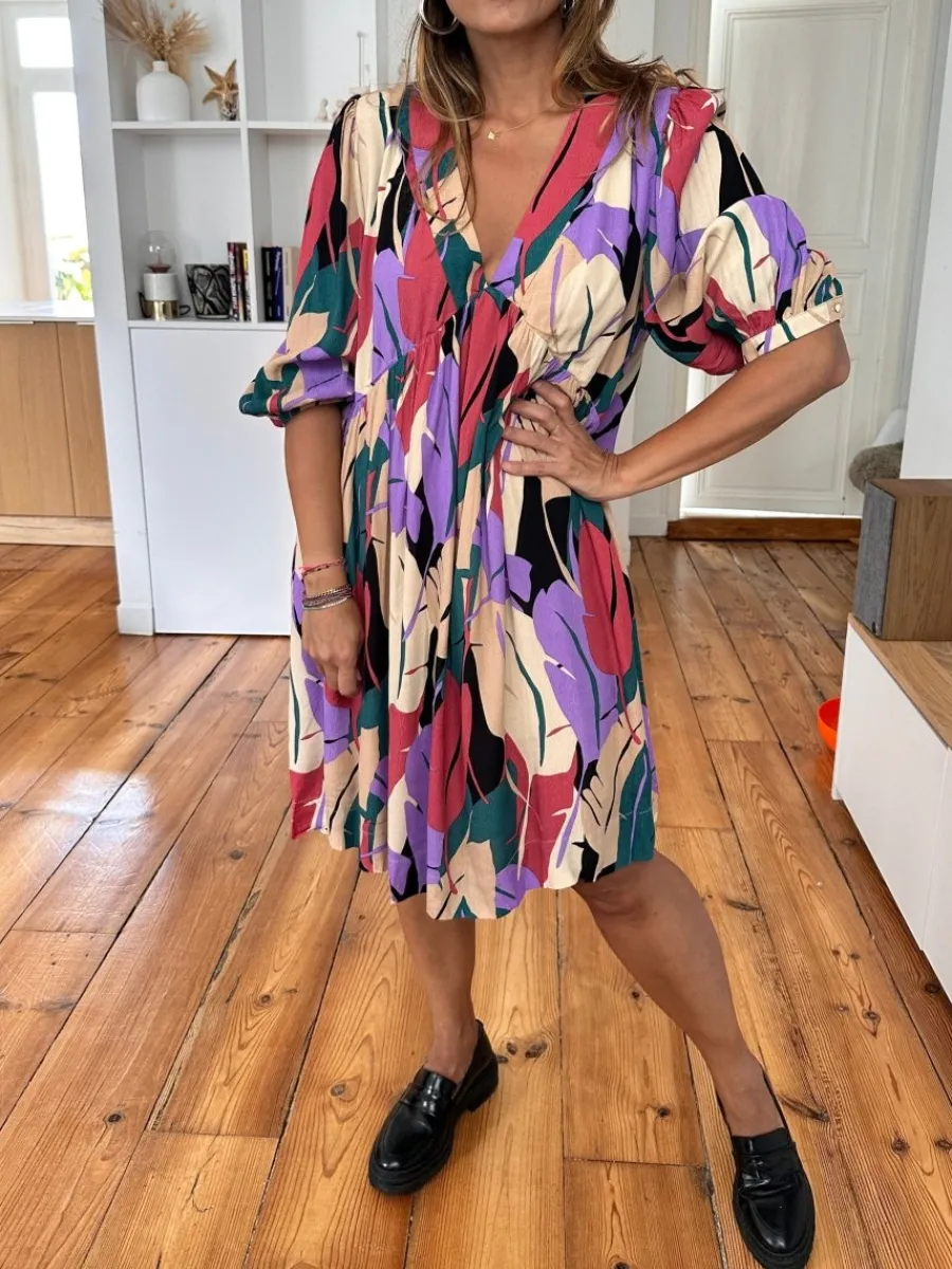 La robe courte NITA est fabriquée dans un tissu en viscose et en rayonne qui dessine une silhouette vaporeuse et aérienne. Son imprimé graphique exclusif, aux feuillages colorés, joue avec les formes et crée du mouvement. Ce modèle a une encolure en V qui sublime le décolleté et une coupe classique qui conviendra aux courbes de chaque femme.