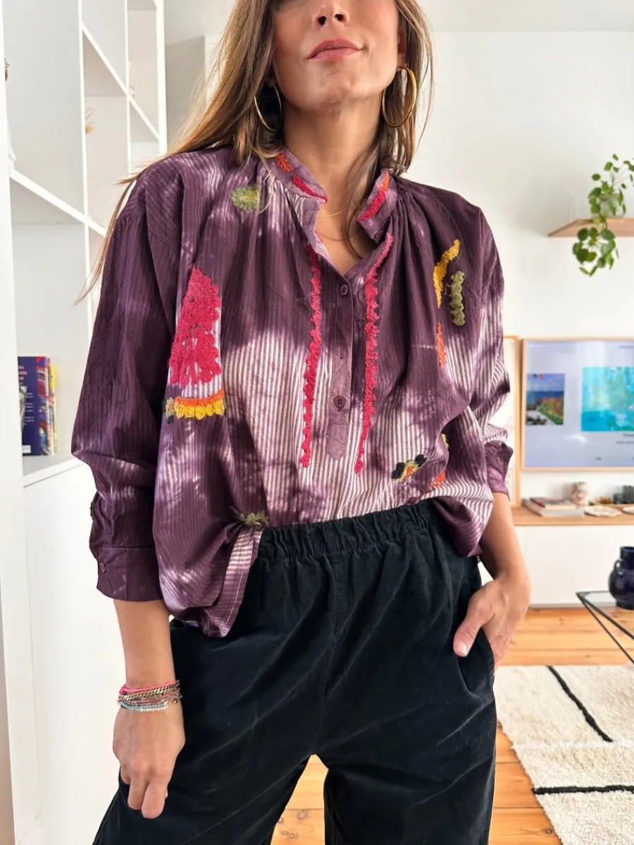 - Broderies colorées sur fond Tie and Dye rayé violet