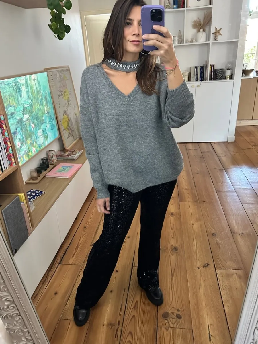 - Pull ample en maille grise