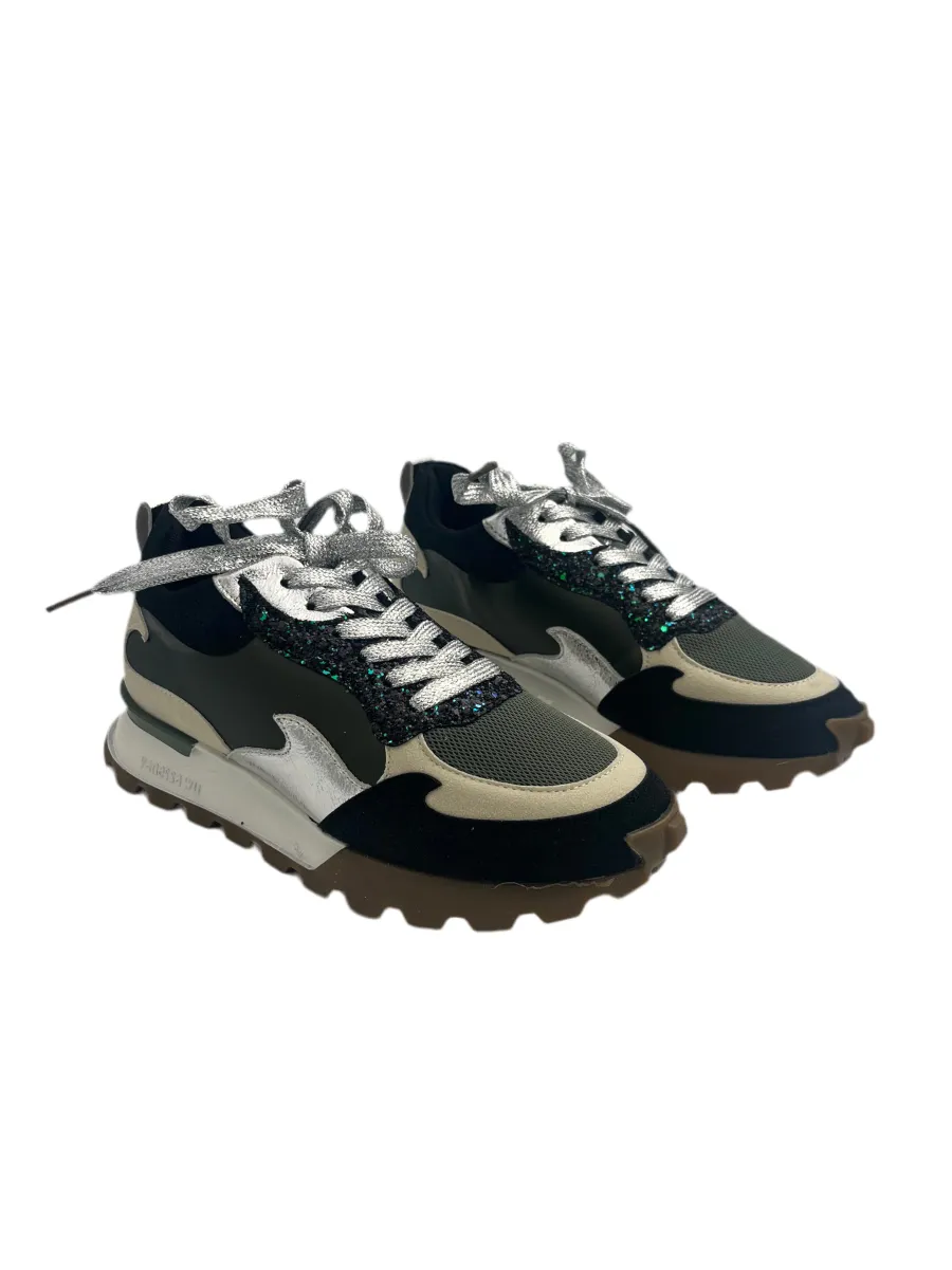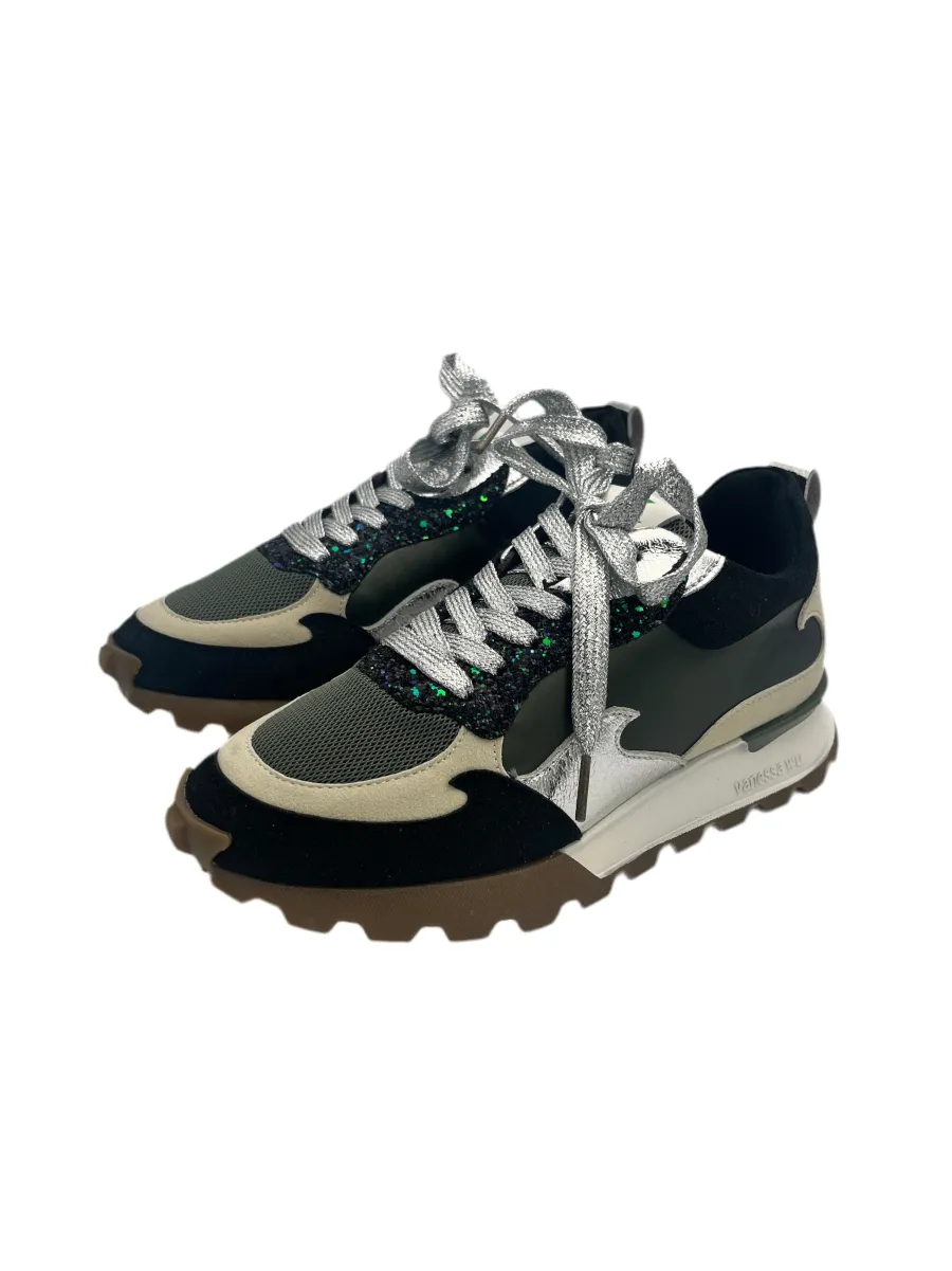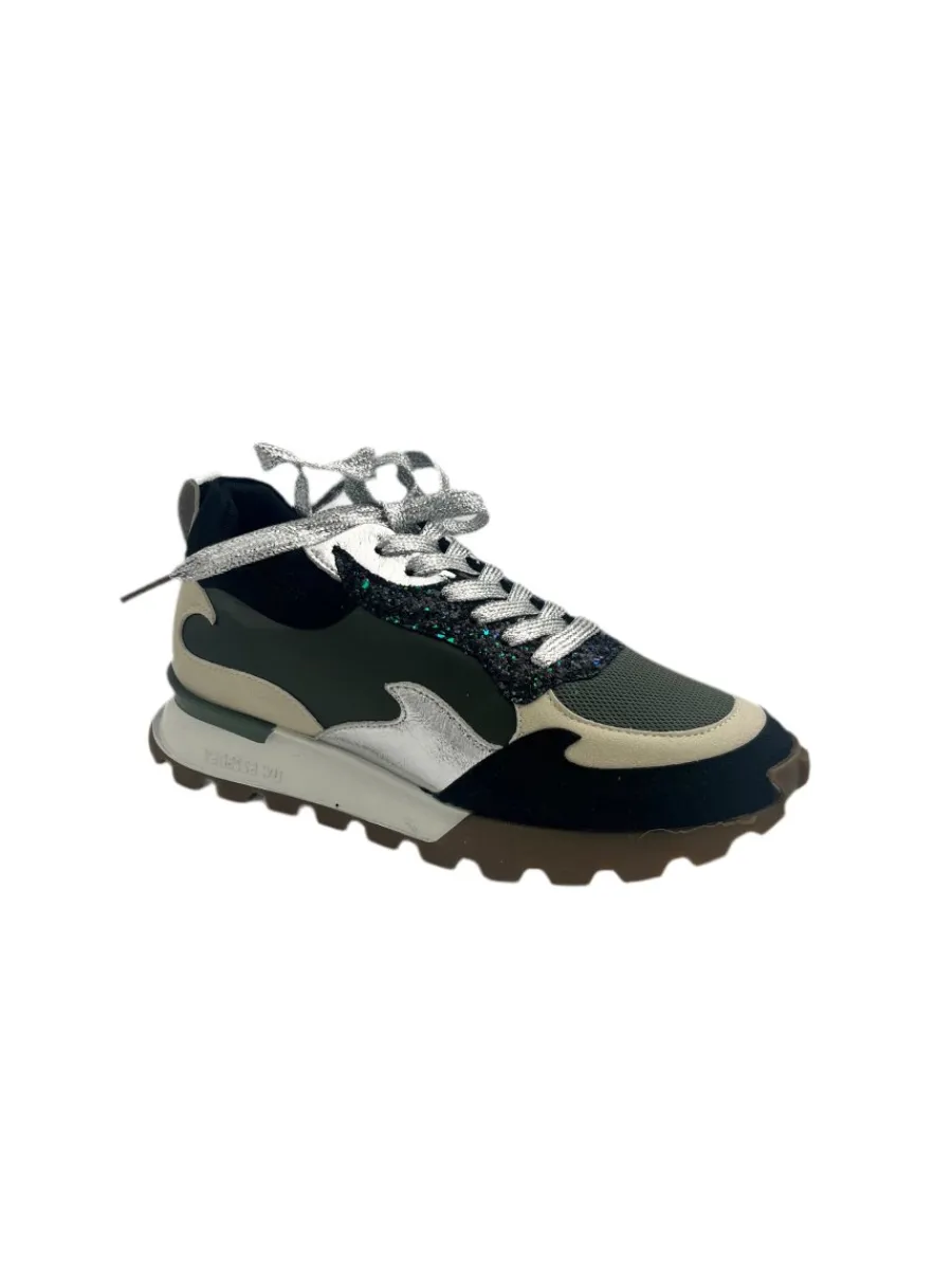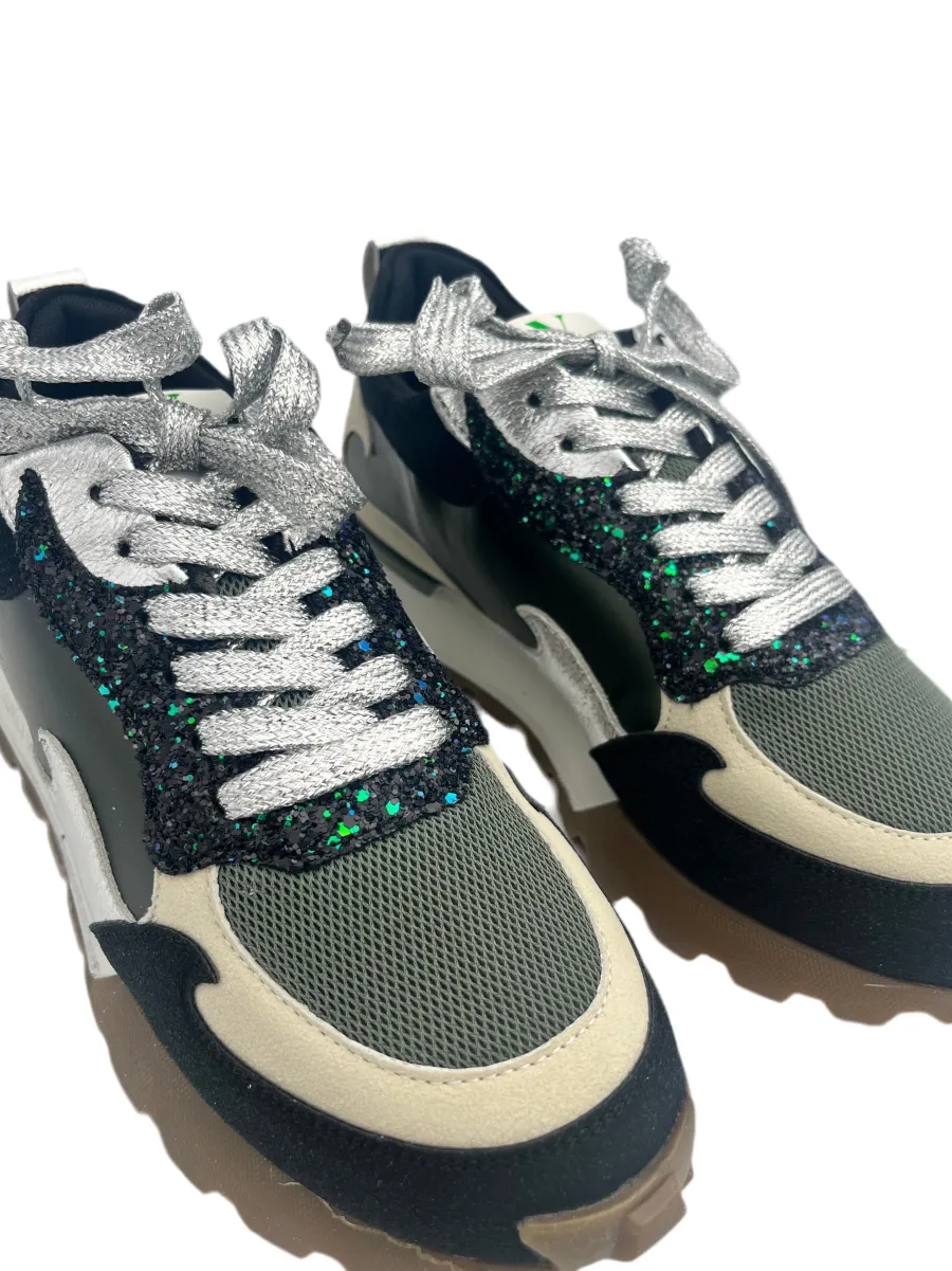 – Garants en similicuir texturé argent avec empiècement en forme de flamme en tissu noir et vert pailleté